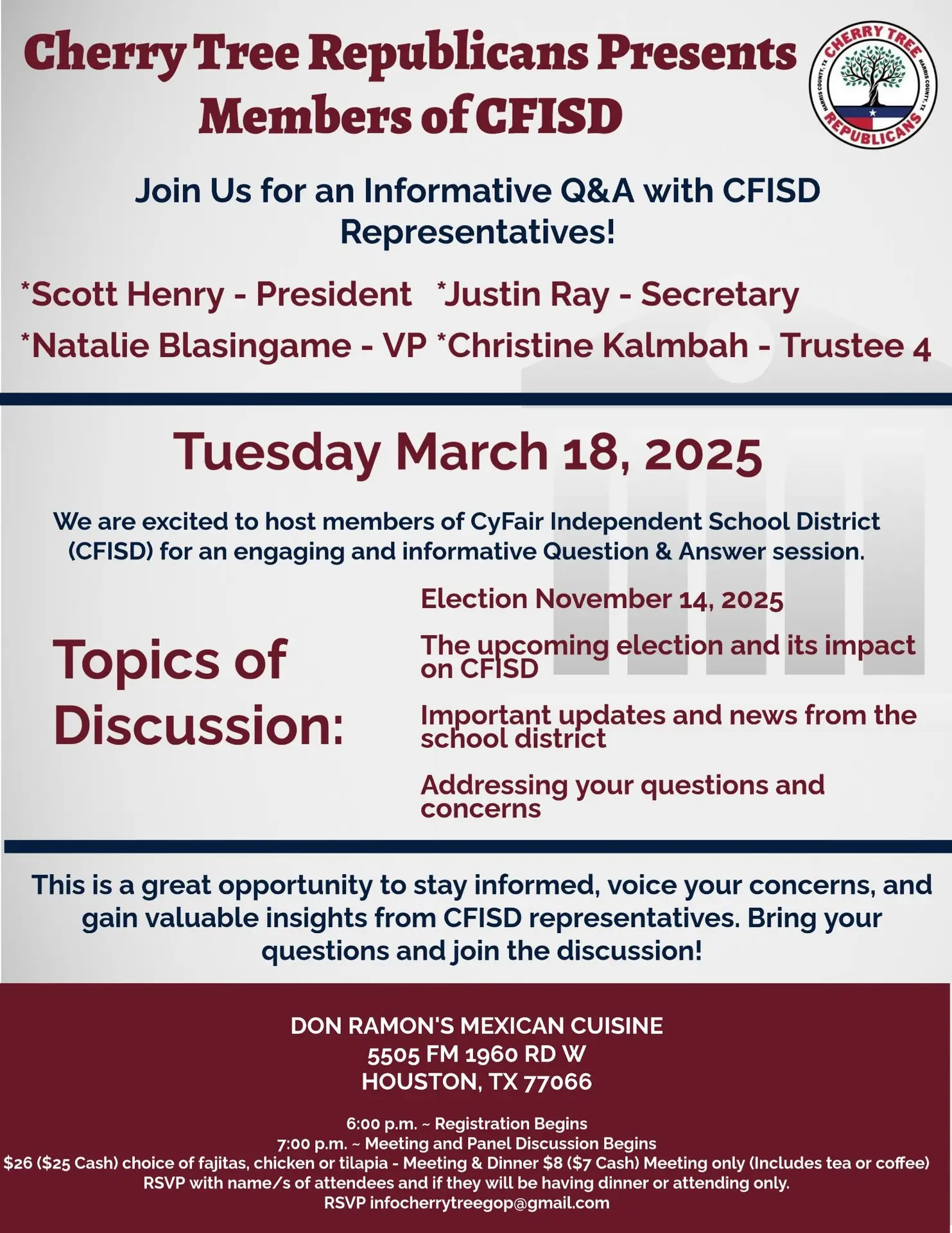 Here’s your chance to meet and speak to several of the CFISD Board of Trustees.
