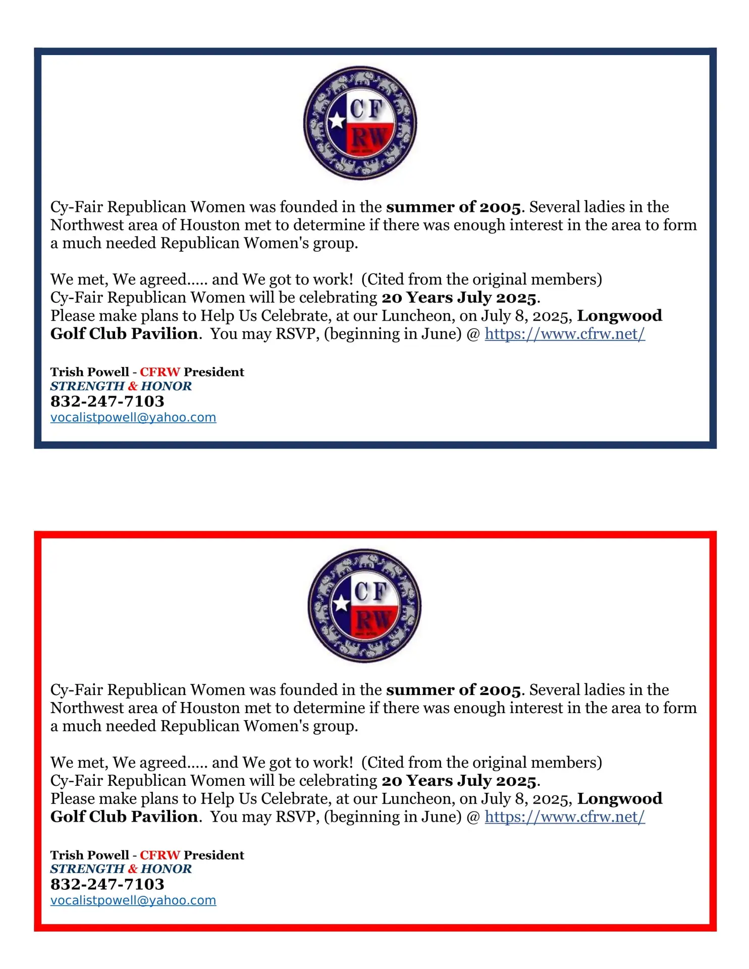 Cy-Fair Republican Women will be celebrating 20 Years July 2025.