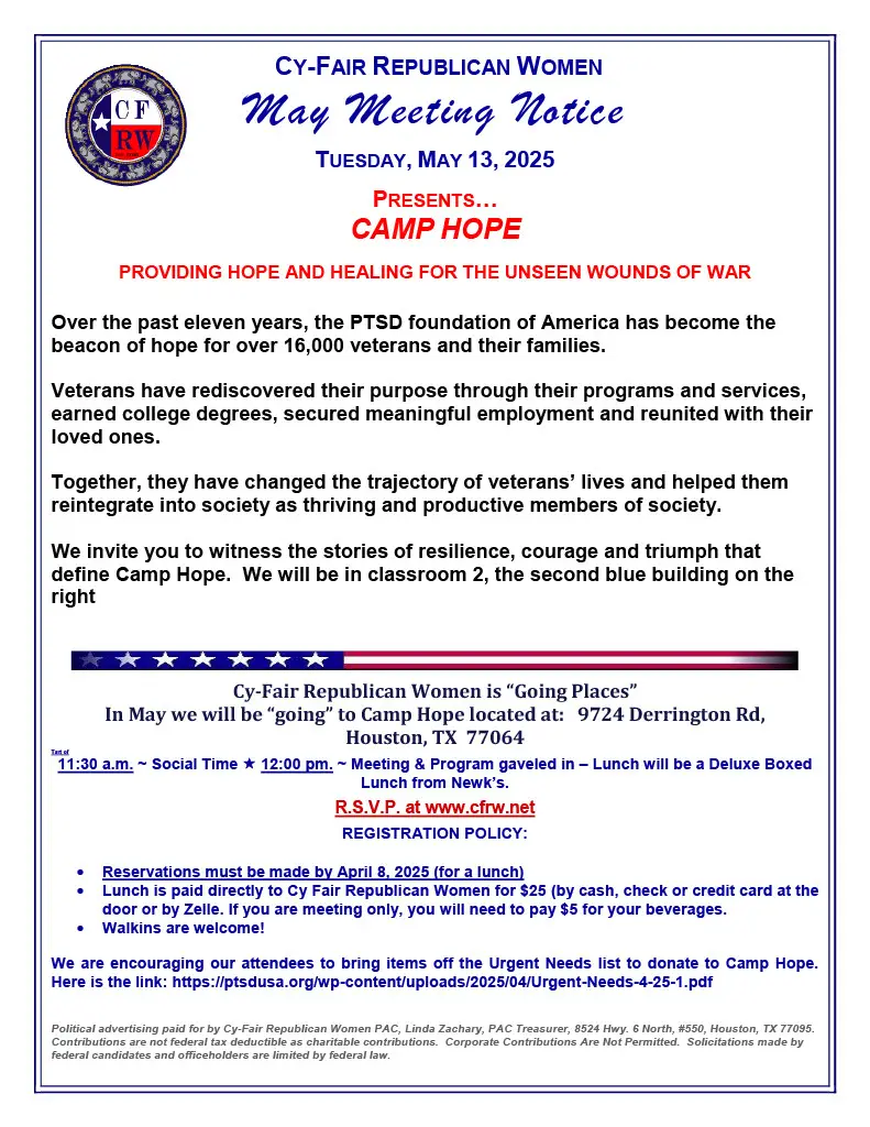 Cy-Fair Republican Women Meeting + Add to Google Calendar + iCal / Outlook export Date May 13 2025 Expired! Time 11:00 am - 1:00 pm Location Camp Hope 9724 Derrington Rd, Houston 77064 Share this event