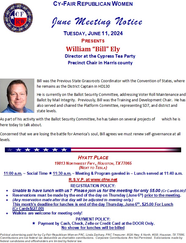 Cy-Fair Republican Women Monthly Meeting RSVP HERE + Add to Google Calendar + iCal / Outlook export Date Jun 11 2024 Expired! Time 11:30 am - 1:00 pm Location Hyatt Place Hyatt Place, 19813 Northwest Freeway Share this event