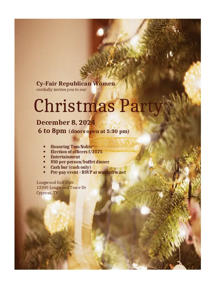 Cy-Fair Reublican Woman’s Christmas Party + Add to Google Calendar + iCal / Outlook export Date Dec 08 2024 Expired! Time 6:00 pm - 8:00 pm More Info RSVP Share this event