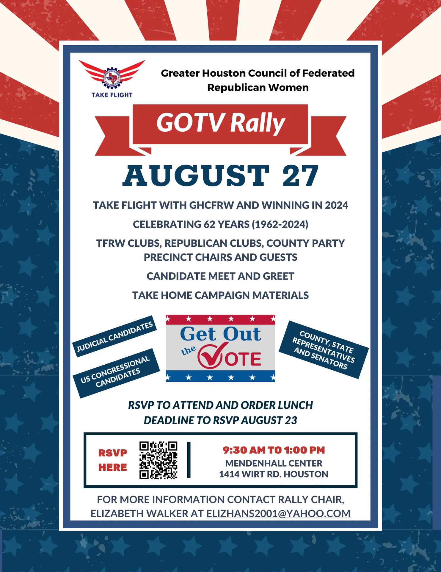 Greater Houston of Federated Republican Women GOTV Rally + Add to Google Calendar + iCal / Outlook export Date Aug 27 2024 Expired! Time 9:30 am - 1:00 pm Location Trini Mendenhall Community Center 1414 Wirt Road Share this event