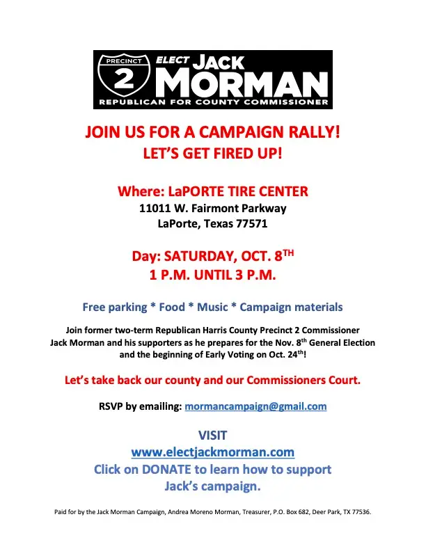 Join former two-term Republican Harris County Precinct 2 Commissioner Jack Morman and his supporters as he prepares for the November 8 General Election and the beginning of Early Voting on October 24!