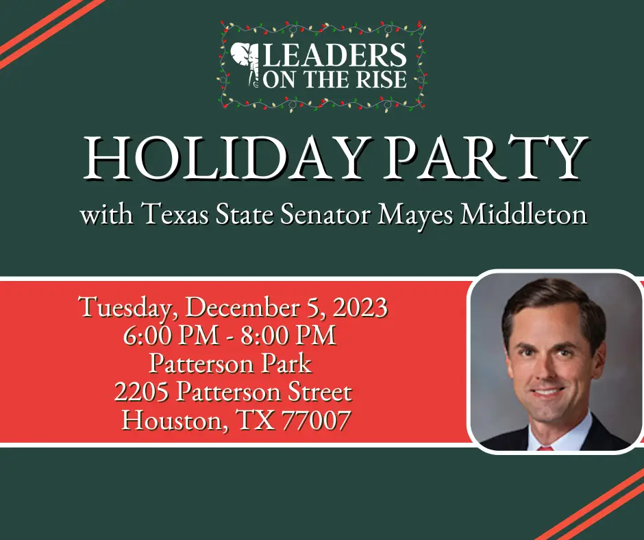 Leaders on the Rise Christmas Party Join Leaders on the Rise for our holiday party with Texas State Senator Mayes Middleton! + Add to Google Calendar + iCal / Outlook export Date Dec 03 2023 Expired! Time 8:00 am - 6:00 pm Share this event