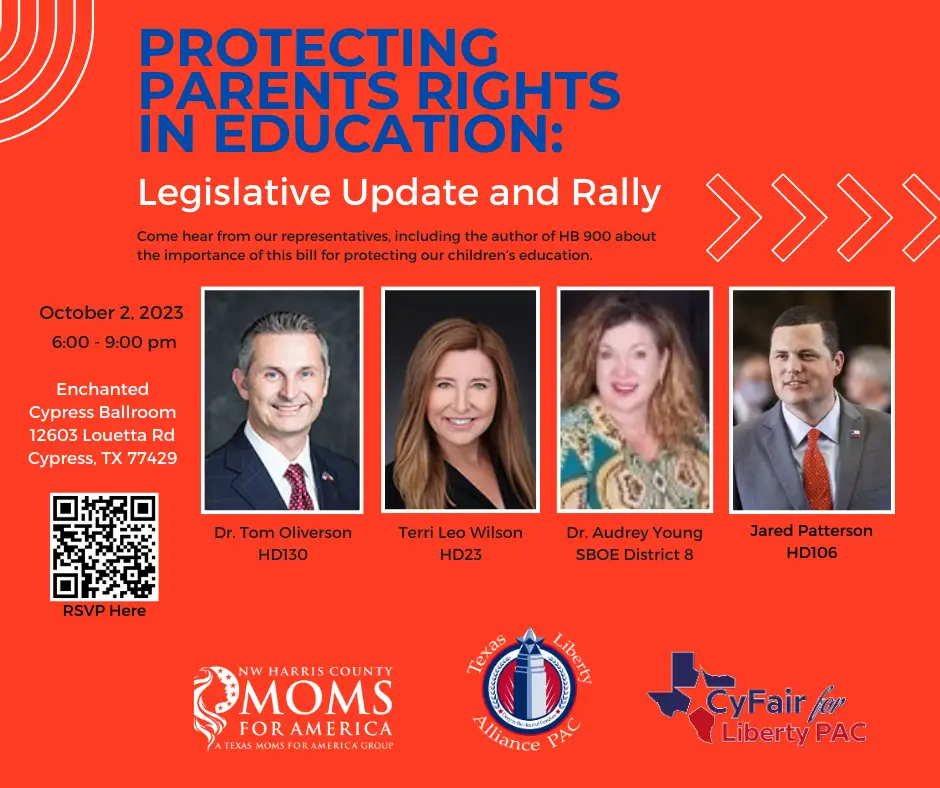 Hear from representatives Dr. Tom Oliverson, HD 130, Terri Leo Wilson, HD23, Dr. Audrey Young, SBOE District 8, and Jared Paterson, HD 106.