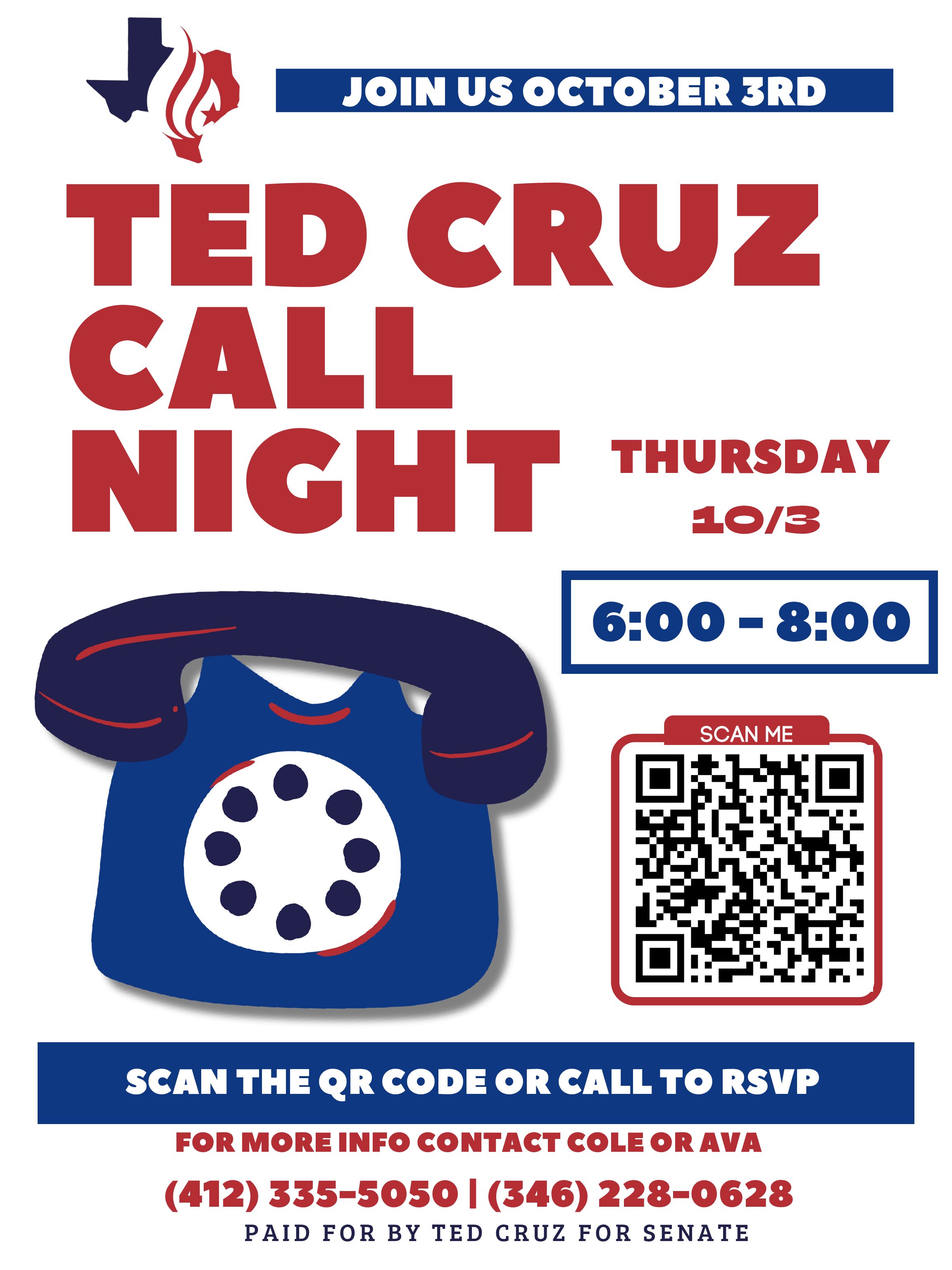 We invite you to join us for an upcoming Phone Banking Night dedicated to supporting Ted Cruz’s Re-election campaign for the United States Senate. This event offers you the chance to actively engage in our state’s political process by connecting with voters, spreading awareness, and playing a vital role in advancing Ted Cruz’s mission. Food and drinks will be provided! Save the date on your calendar, and we eagerly anticipate your participation!