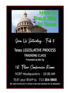 Texas Legislative Process Training Class presented by Bill Ely Please RSVP to 713-364-9868. + Add to Google Calendar + iCal / Outlook export Date Feb 08 2025 Expired! Time 10:00 am - 12:30 pm Location Harris County Republican Party Headquarters 8588 Katy Fwy.; 1st Floor Lg Conference Room Share this event
