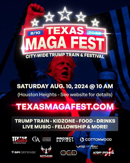 Texas MAGA Fest Purchase Tickets HERE + Add to Google Calendar + iCal / Outlook export Date Aug 10 2024 Expired! Time 10:00 am - 12:00 pm Location Cottonwood 3422 N. Shepard Drive Share this event