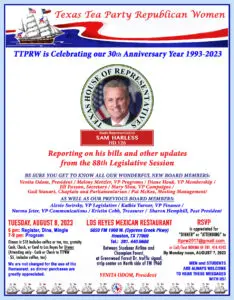 Texas Tea Party Republican Women Featuring State Rep. Sam Harless HD 126 Contact: [email protected] Norma 281.414.4243 + Add to Google Calendar + iCal / Outlook export Date Aug 08 2023 Expired! Time 6:00 pm - 9:00 pm Location Los Reyes Mexican Restaurant 05050 FM 1960 West Share this event