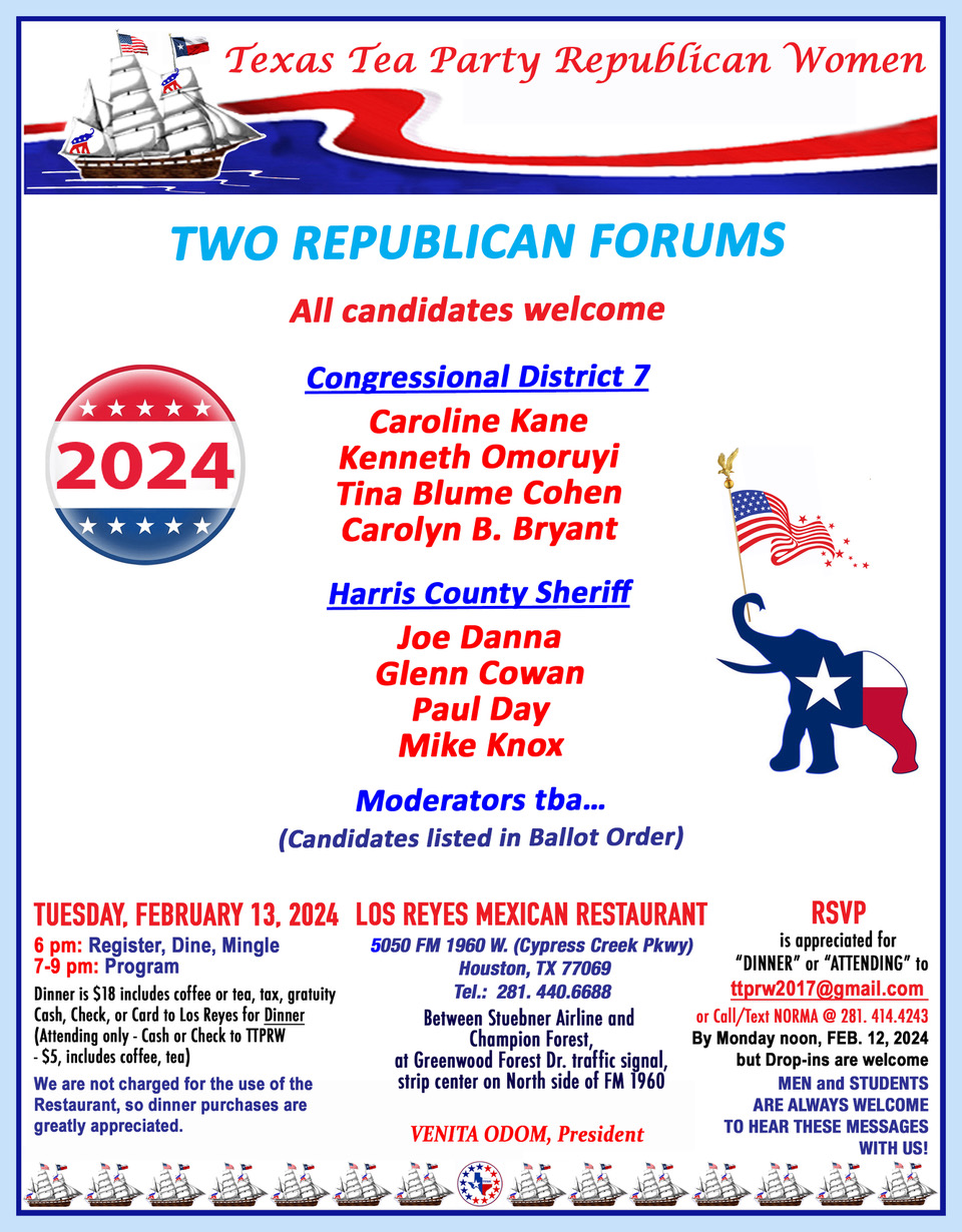Texas Tea Party Republican Women Candidates Forum — CD 7 and Harris County Sheriff + Add to Google Calendar + iCal / Outlook export Date Feb 13 2024 Expired! Time 6:00 pm - 9:00 pm Location Los Reyes Mexican Restaurant 05050 FM 1960 West Share this event