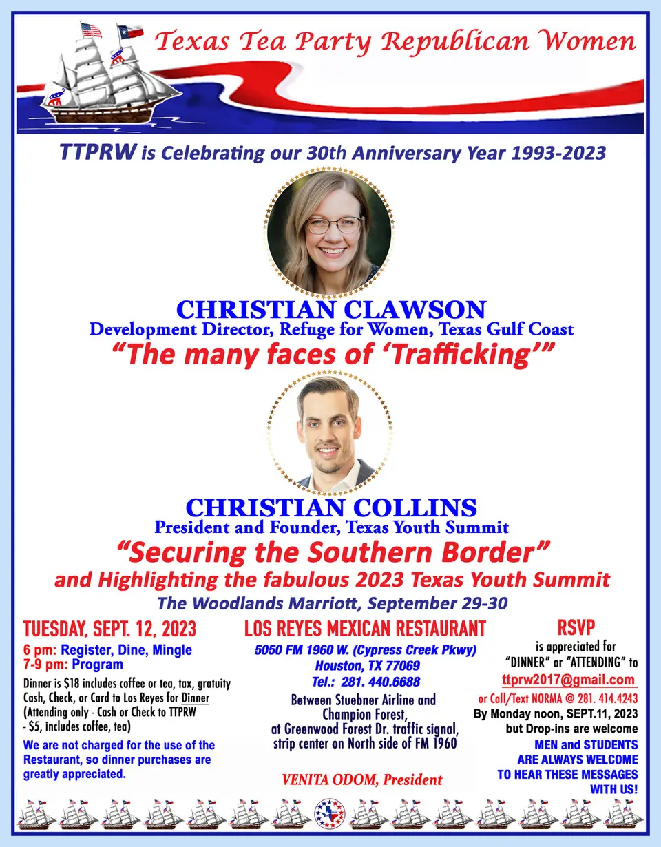 Join TTPRW for their monthly meeting featuring special guests: Development Director, Refugee for Women, Gulf Coast Christian Clawson, who will discuss “The many faces of ‘trafficking'” and President and Founder of the Texas Youth Summit Christian Collins, who will discuss securing the southern border.