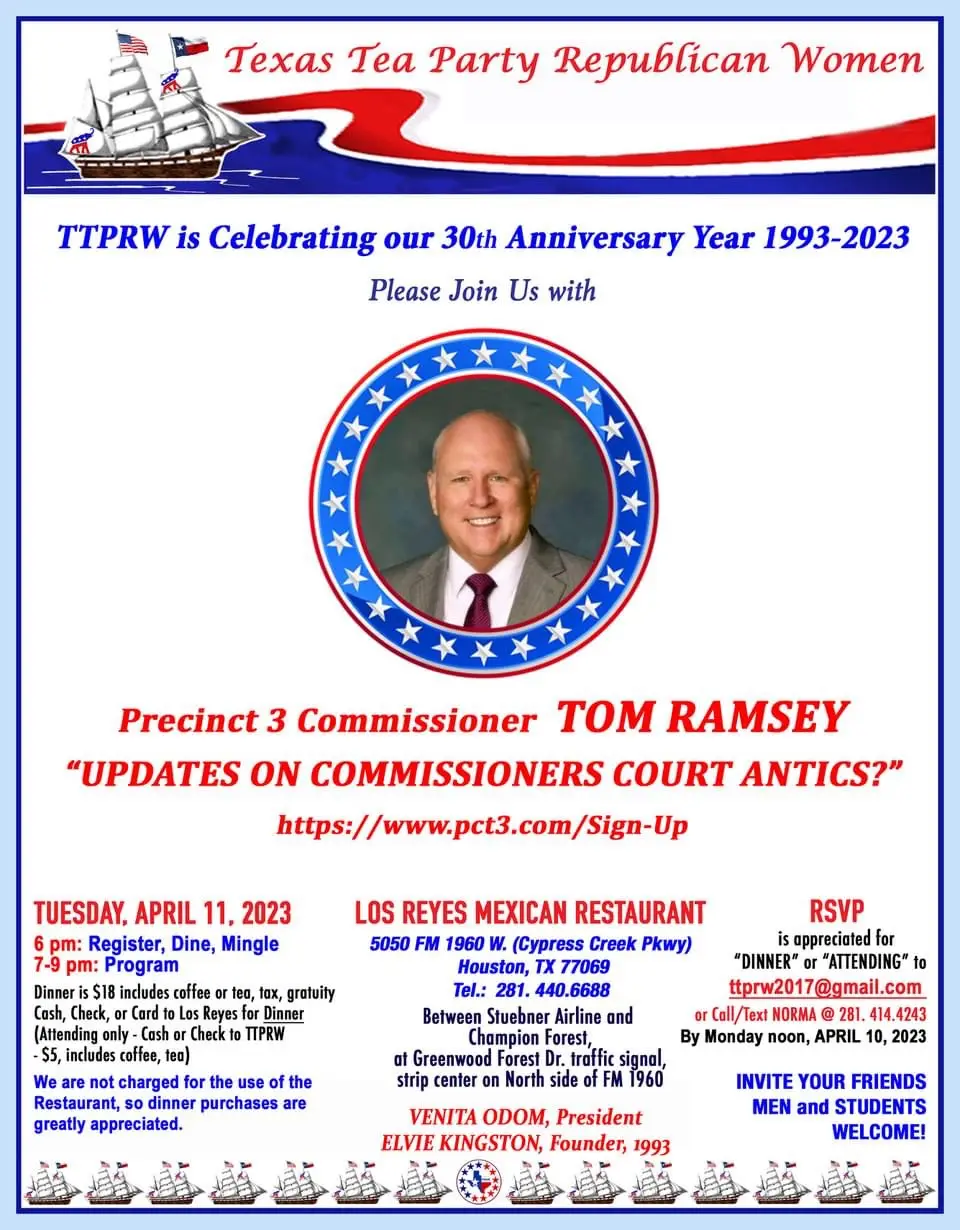 Come join the Texas Tea Party Republican Women as they host Commissioner Tom Ramsey while he gives an update on commissioner court antics.