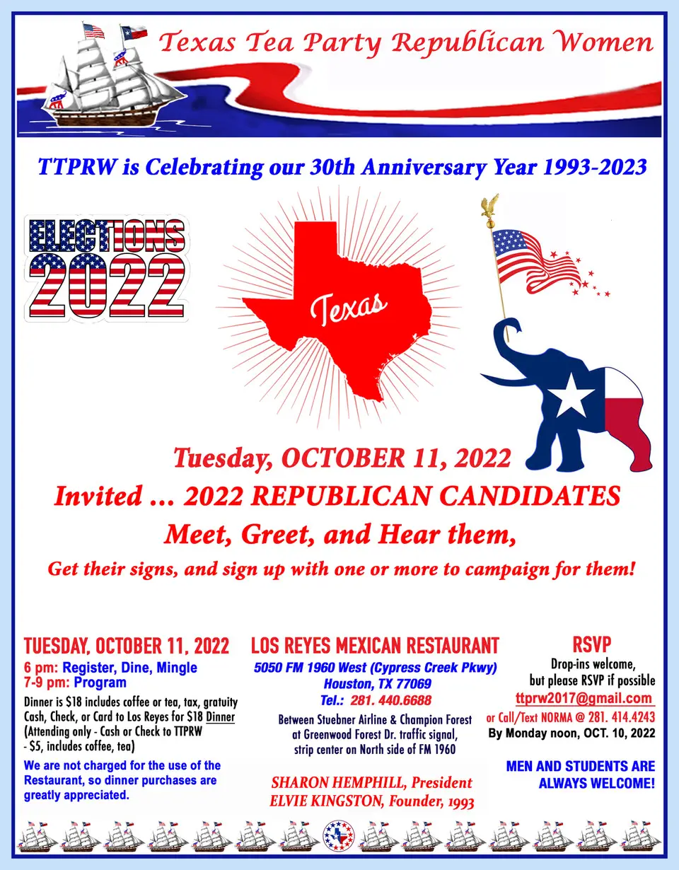 Texas Tea Party Republican Women Meeting TTPRW invites you to our monthly meeting. Please RSVP to [email protected] + Add to Google Calendar + iCal / Outlook export Date Jun 14 2022 Expired! Time 6:00 pm - 9:00 pm Location Los Reyes Mexican Restaurant 05050 FM 1960 West Share this event