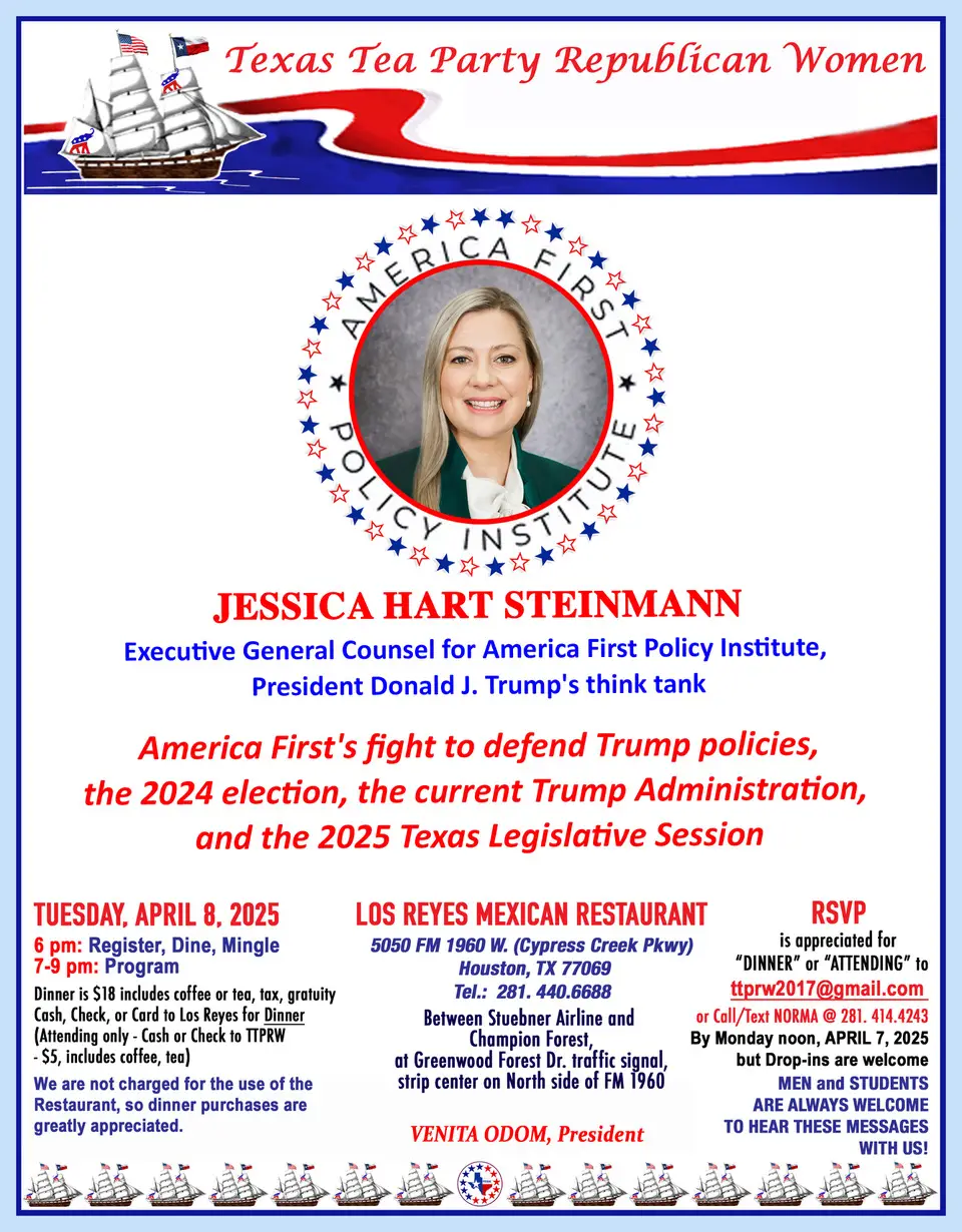 Texas Tea Republican Women – Jessica Hart Steinmann + Add to Google Calendar + iCal / Outlook export Date Apr 08 2025 Expired! Time 6:00 pm - 9:00 pm Location Los Reyes Mexican Restaurant 05050 FM 1960 West Share this event
