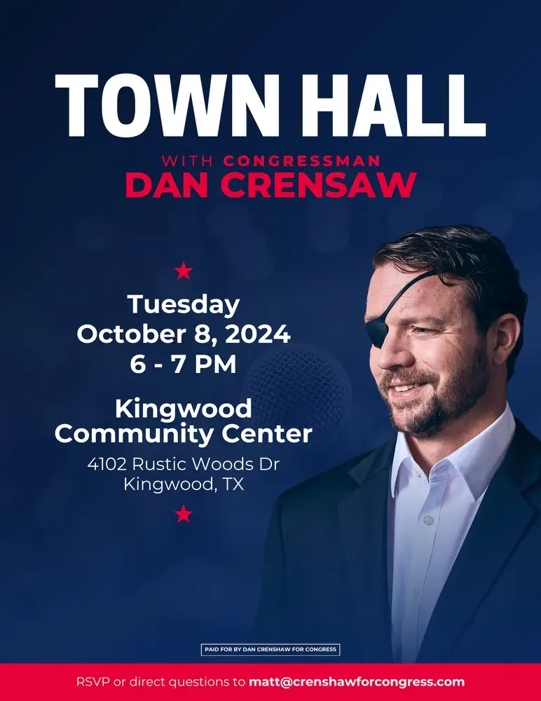 Town Hall with Congressman Dan Crenshaw RSVP or direct questions to [email protected] + Add to Google Calendar + iCal / Outlook export Date Oct 08 2024 Expired! Time 6:00 pm - 7:00 pm Location kingwood community center 4102 Rustic Woods Dr Share this event