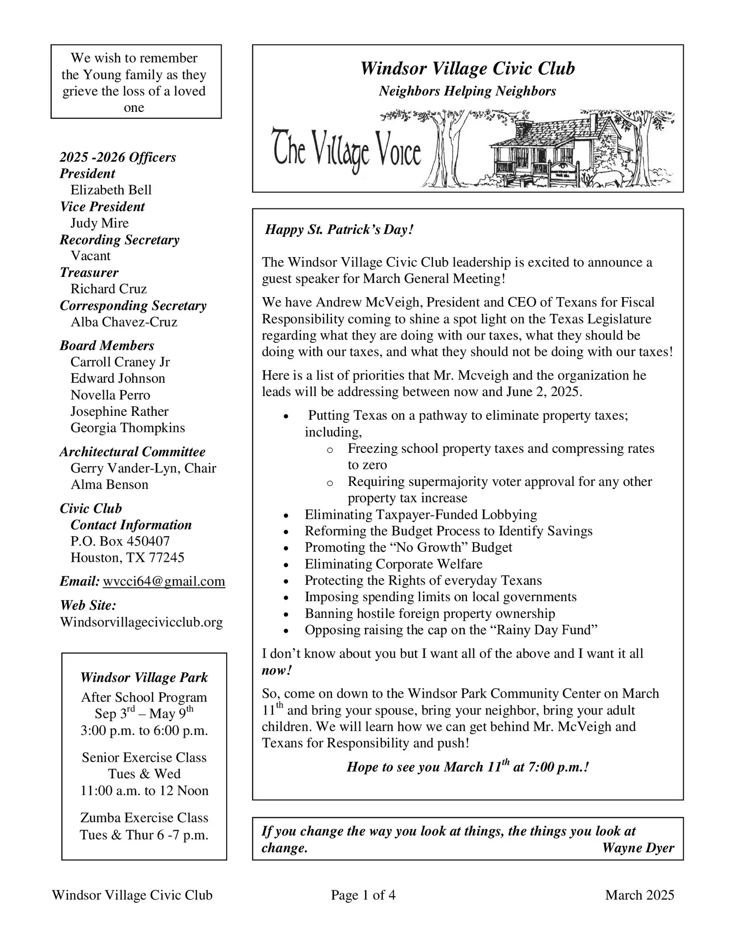 Windsor Village Civic Club Monthly General Meeting with speaker Andrew McVeigh of Texans for Fiscal Responsibility + Add to Google Calendar + iCal / Outlook export Date Mar 11 2025 Expired! Time 7:00 pm - 8:00 pm Location Windsor Village Park Community Center 14441 Ln, Houston TX 77085 Share this event