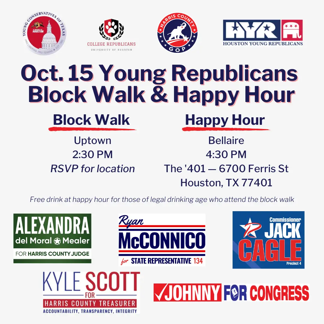 Join young Republicans from all across Harris County as we block walk in Uptown, followed by a happy hour in Bellaire! You must RSVP to receive the location for the block walk.