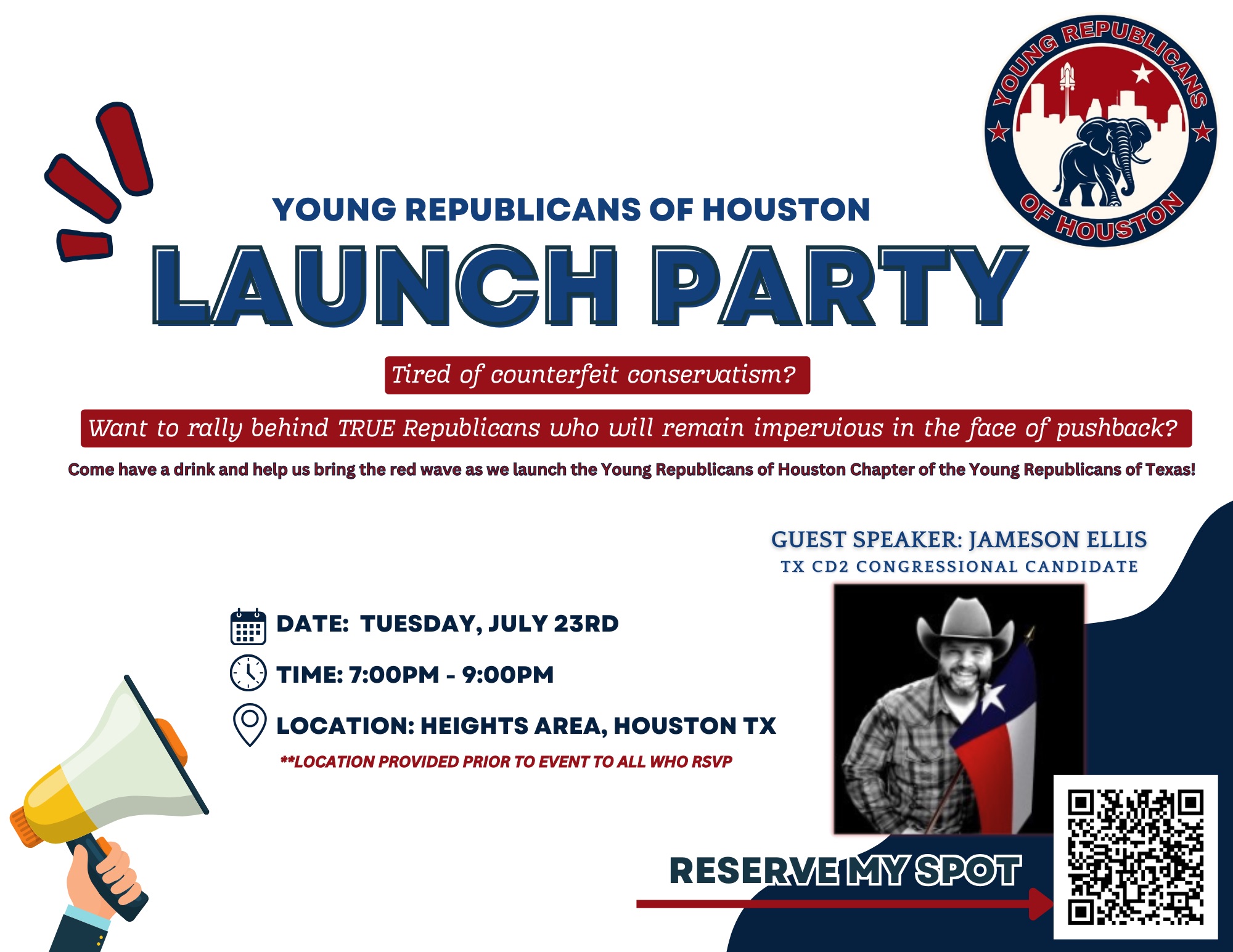 Young Republicans of Houston Launch Party + Add to Google Calendar + iCal / Outlook export Date Jul 23 2024 Expired! Time 7:00 pm - 9:00 pm Share this event